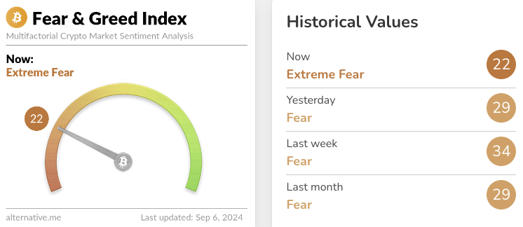 نتيجة لذلك، انخفض سوق العملات الرقمية إلى منطقة "الخوف الشديد"، وفقًا لمؤشر الخوف والجشع للعملات الرقمية الذي يقيس معنويات السوق. في السادس من سبتمبر، انخفض المؤشر إلى 22، مما يشير إلى "الخوف الشديد" - وهو تباين واضح عن اليوم السابق حيث سجل المؤشر 29، مما يشير إلى "الخوف". ويعد هذا أدنى مستوى للمؤشر منذ الثامن من أغسطس عندما وصل إلى 20.