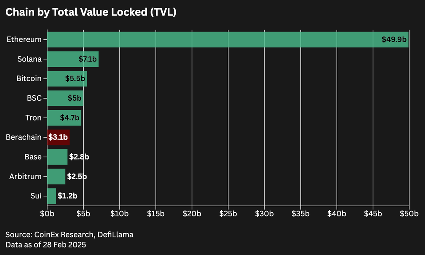 من المفارقات أن التوجه الهبوطي في السوق تزامن مع إطلاق الشبكة الرئيسية لمشروع Berachain، وهي سلسلة بلوكشين من الطبقة الأولى متوافقة مع إيثريوم، مبنية على Cosmos SDK. حقق الإطلاق نجاحًا كبيرًا، حيث تم إدراج أكثر من 110 مشاريع وتأمين ودائع مسبقة بقيمة 2.6 مليار دولار من خلال مبادرة Royco. تجاوزت القيمة الإجمالية المقفلة (TVL) في Berachain 3.1 مليار دولار، مما جعلها سادس أكبر بلوكشين من حيث TVL، مما يعكس نجاحها المبكر على الرغم من تراجع السوق بشكل عام.