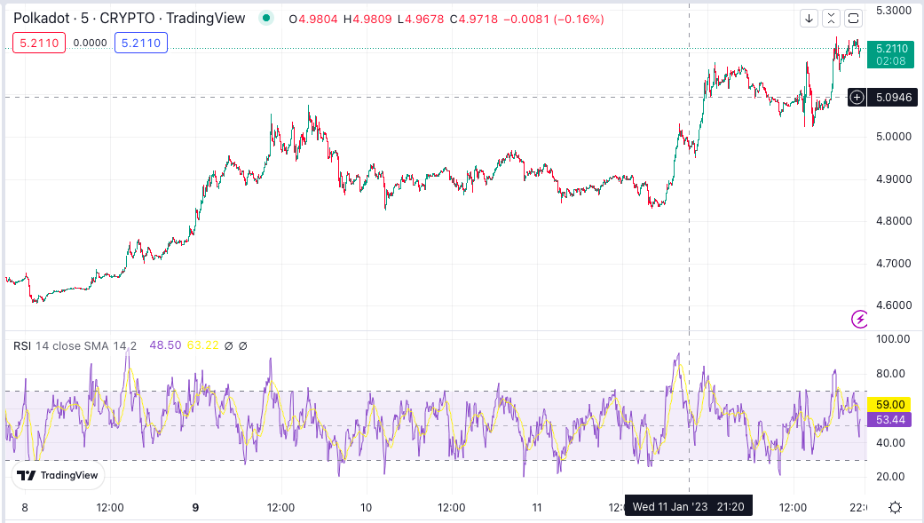 لكي يستمر الرمز المميز في الارتفاع، يجب أن يتحرك مؤشر القوة النسبية فوق 68.00 حتى تتمكن بولكادوت من كسر خط المقاومة الجديد عند 5.2 دولار. يذكر أن القيمة السوقية للعملة قد ارتفعت إلى 6.21 مليار دولار.