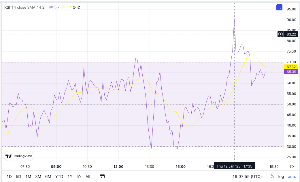 كما و وصل مؤشر القوة النسبية إلى 90٪ مساء 12 يناير هو أعلى مستوى له منذ أكثر من سنة و نصف. لكن لم يستقر بل تذبذب في المجال 67-90٪.