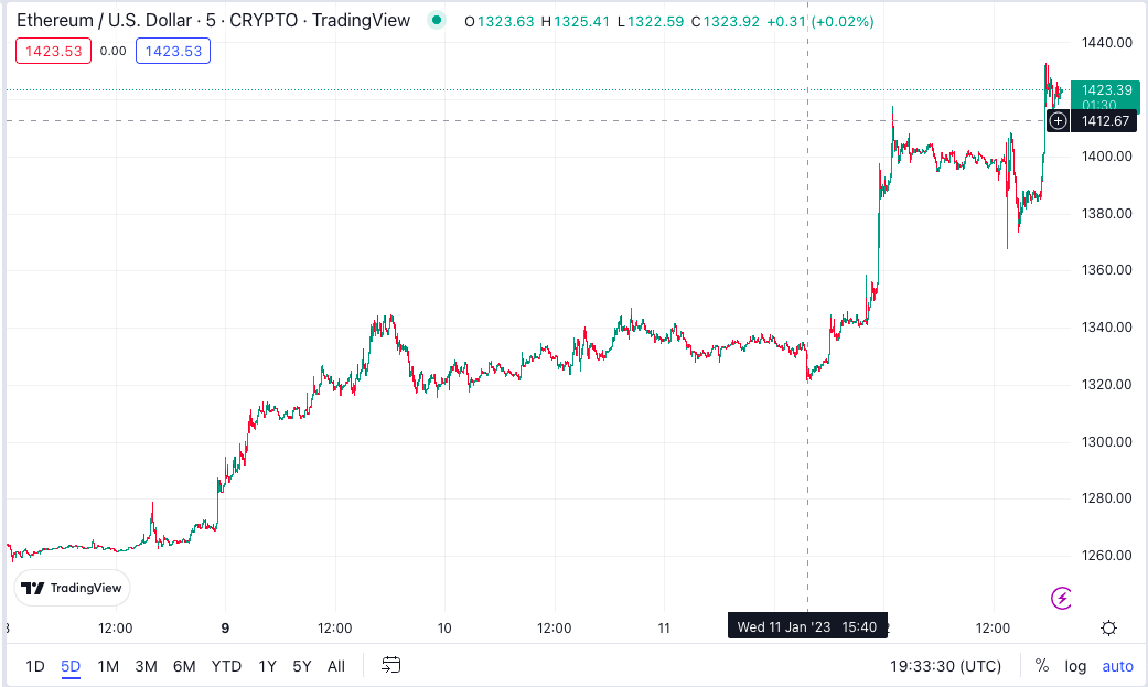 ارتفع سعر عملة ايثريوم أيضًا و حقق اعلى سعر له منذ الثامن من نوفمبر2022. حيث تمكن أخيرا من استعادة خط 1400 دولار خلال اليوم 12 يناير 2023. كان ايثريوم (ETH) أيضًا قد وصل إلى أعلى مستوى له خلال جلسة اليوم منذ أزمة FTX. حيث انتقلت الأسعار إلى أعلى مستوى لها في شهرين.