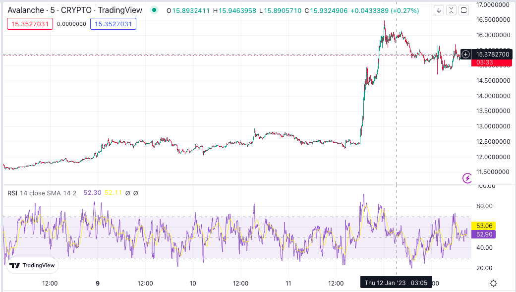 انتقل AVAX/USD إلى الذروة عند 16.48 دولارًا خلال وقت سابق من 12 يناير قبل أن يتراجع في نهية اليوم إلى 15.42 دولار. وكانت العملة قد سجلت في 11 يناير سعرا منخفضا عند 12.23 دولارًا. دفع ارتفاع الأسعار يوم الخميس Avalanche إلى أعلى نقطة له منذ 8 نوفمبر، عندما كان السعر عند ذروته عند 18.15 دولارًا.
