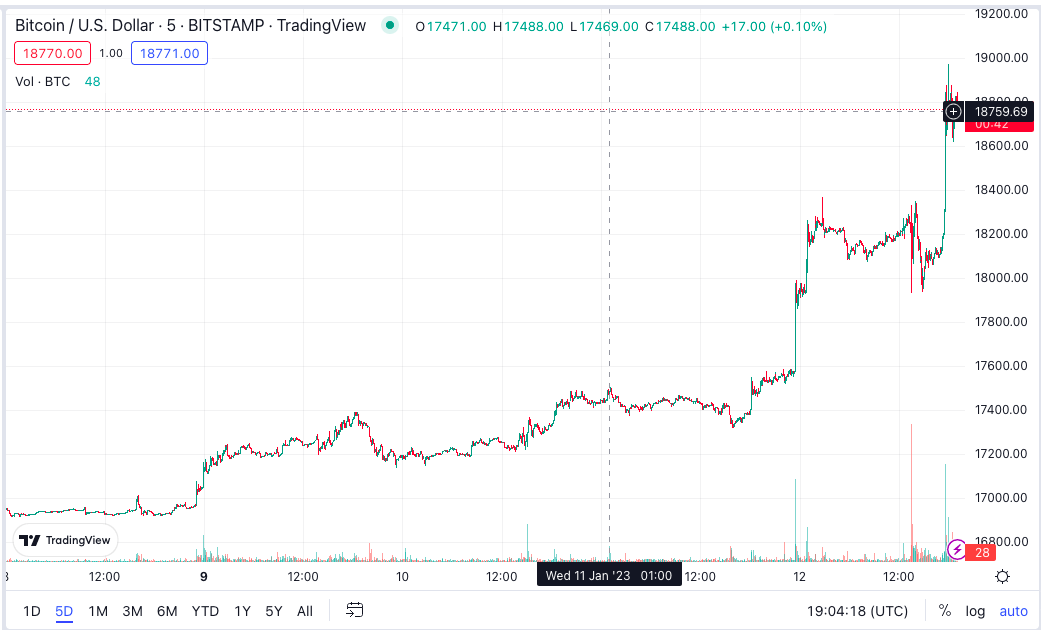 رغم إن الأسواق الأمريكية تستعد لمزيد من الانخفاض في أسعار المستهلكين. إلا أن زوج BTC/USD ارتفع إلى أعلى مستوى عند 18855 دولارًا يوم 12 يناير عند الساعة الحادية عشر مساءً، بعد 26 ساعة من التداول عند 17358 دولارًا أمريكيًا.