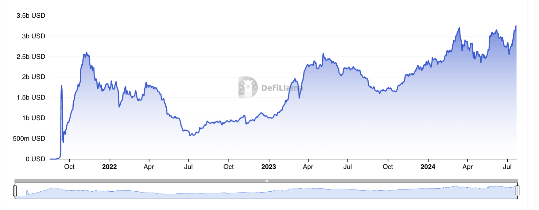 وفقًا لبيانات DefiLlama، من بين أفضل 5 شبكات من حيث TVL، شهدت أربيتروم أكبر نمو بعد سولانا خلال الأسبوع الماضي. بلغت TVL الشبكة 3,25 مليار دولار، وقد ارتفعت بنسبة 10% خلال الأيام السبعة الماضية. خلال الشهر الماضي، ارتفعت TVL لأربيتروم بنسبة 14%. وتقع TVL حاليًا في أعلى مستوياتها منذ إطلاق البروتوكول L2 في أغسطس 2021.