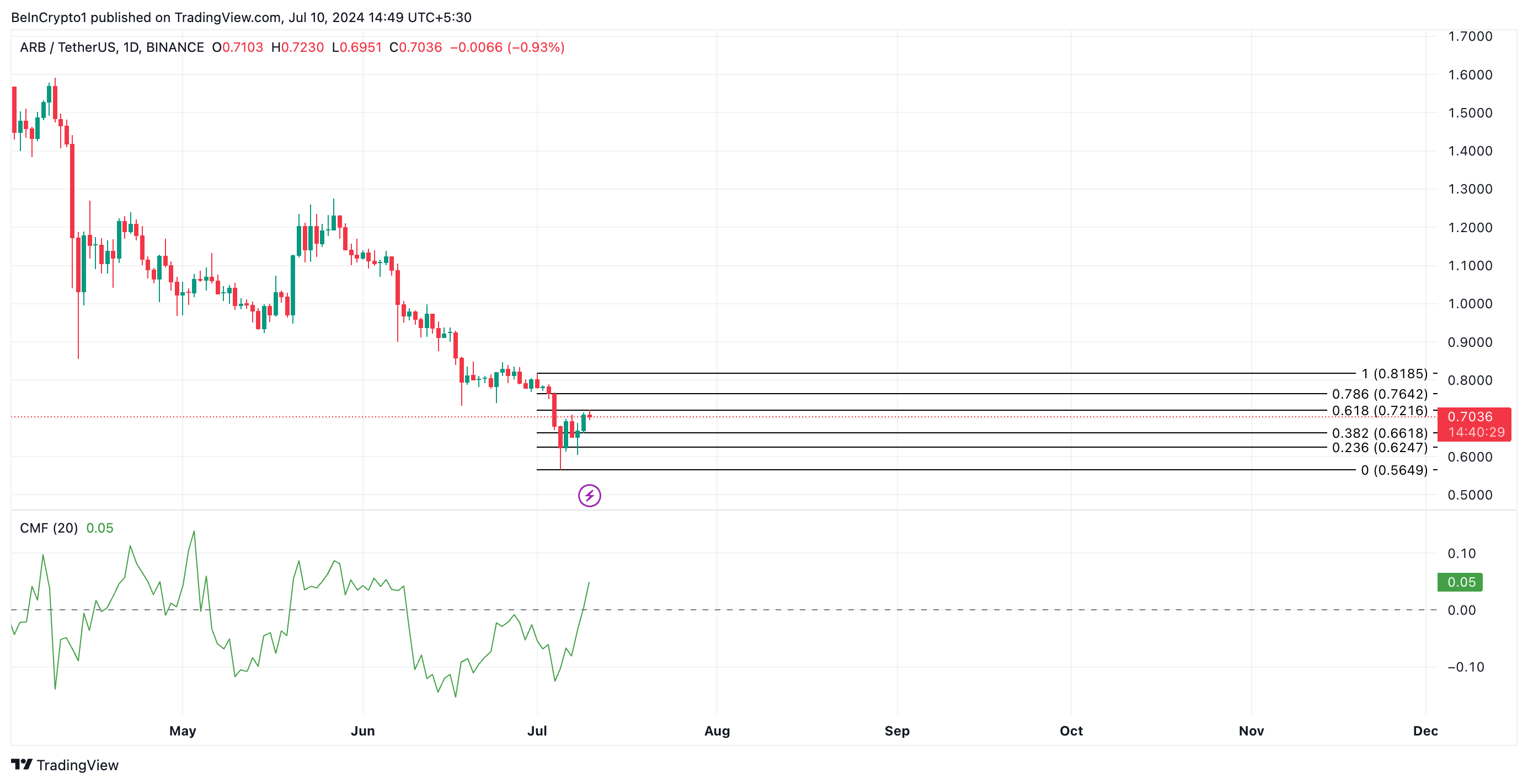 بينما كان سعر أرب في اتجاه نزولي خلال الأسبوع الماضي، فإن مؤشر تدفق الأموال تشايكين (CMF) في اتجاه صعودي. يقيس هذا المؤشر كيفية تدفق الأموال إلى الأصل وخارجه.