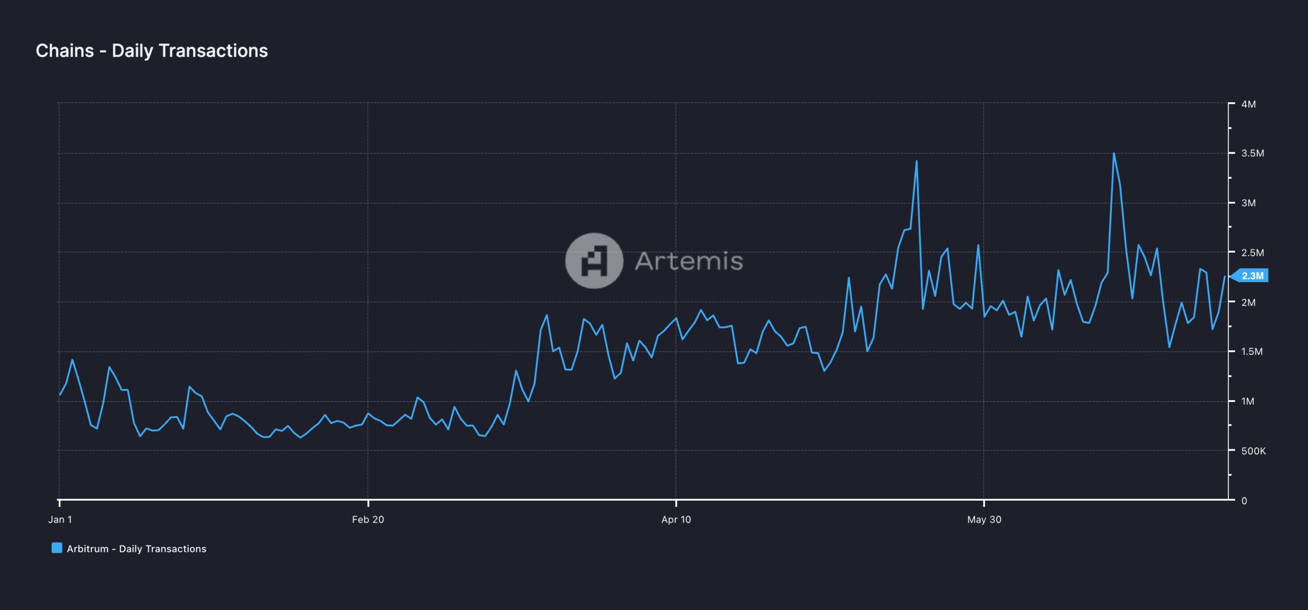 بعد الوصول إلى ذروة العام حتى تاريخه والتي بلغت 3,5 مليون، بدأ عدد المعاملات اليومية على L2 في الانخفاض. وقد انخفض منذ ذلك الحين بنسبة 34%.