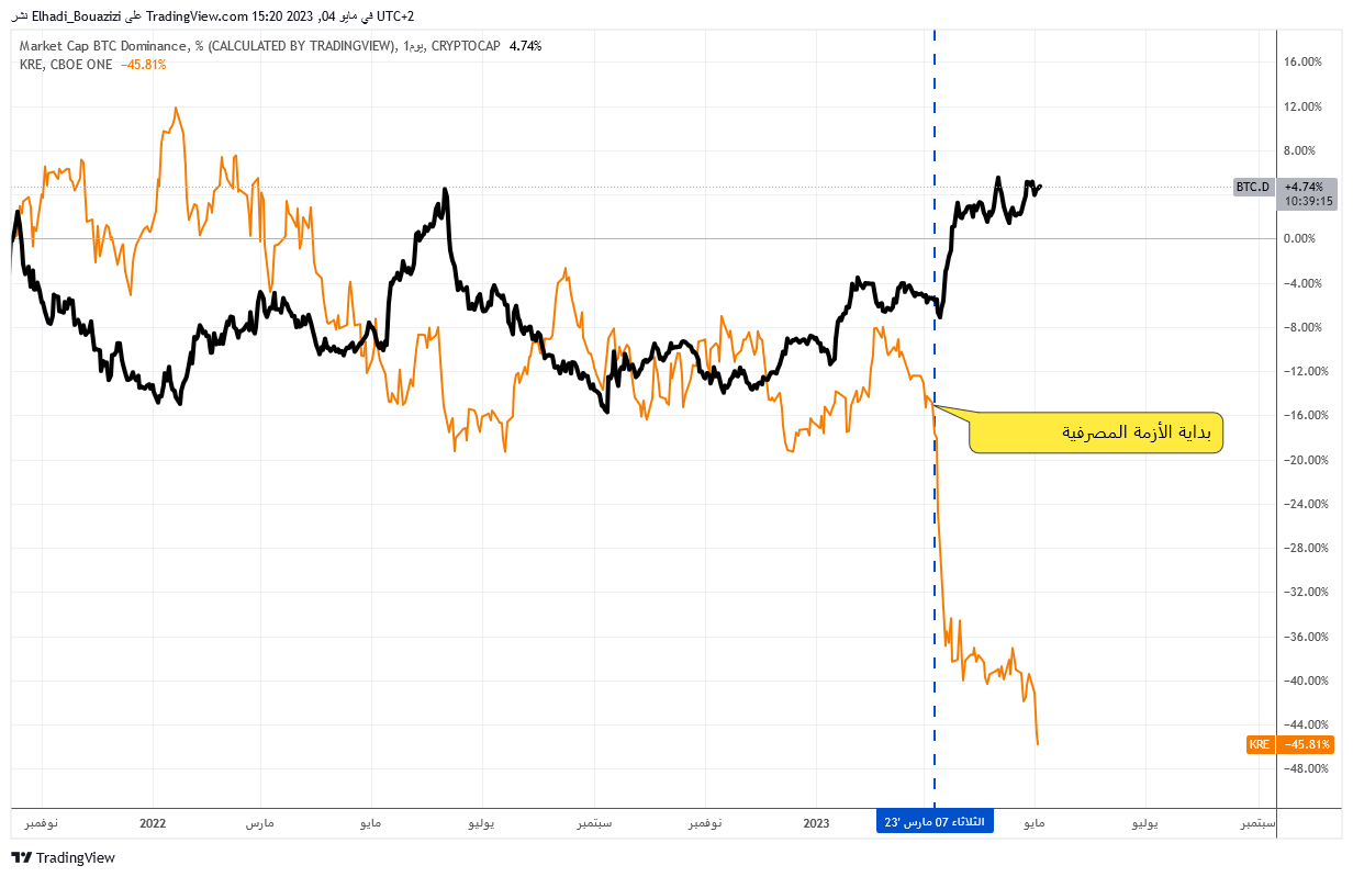 الأزمة المصرفية الأخيرة في الولايات المتحدة أثرت بشكل كبير على سوق العملات الرقمية. وخاصة سعر البيتكوين. فقد ارتفع معدل هيمنة البتكوين على سوق العملات الرقمية إلى أعلى مستوى له خلال 22 شهرًا قرب 49% منذ بداية الاضطراب في قطاع المصارف الأمريكية في أوائل شهر مارس. ويدل ذلك على تفوق أداء سعر البيتكوين على باقي العملات الرقمية.