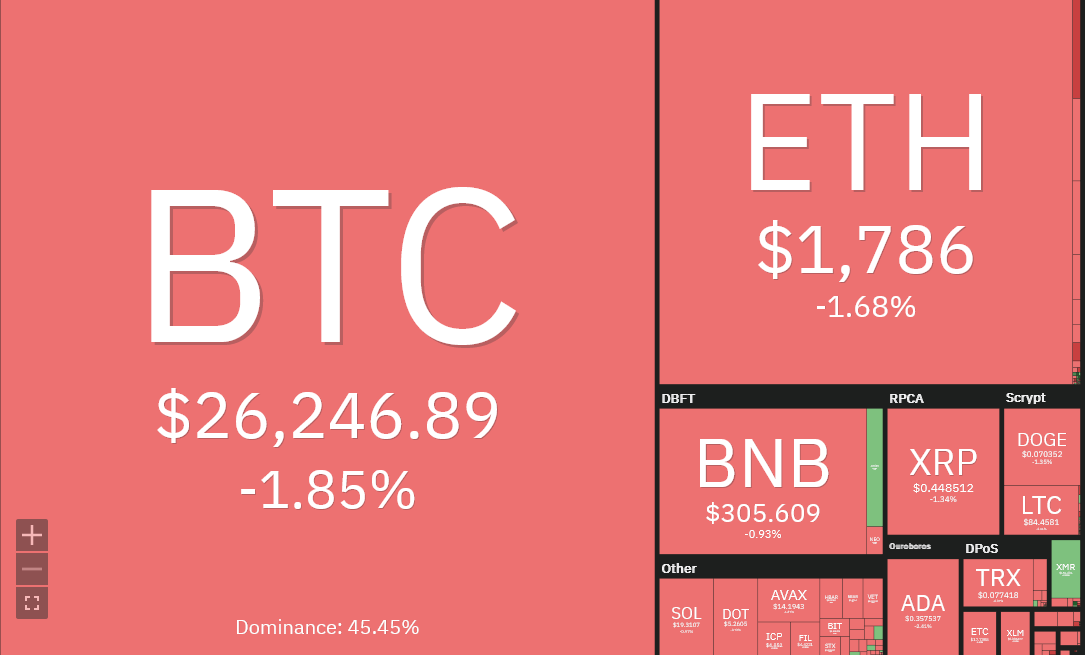 هبط سعر البيتكوين بنسبة 4.26% خلال الـ 24 ساعة الماضية ليصل إلى 26003 دولار. كما تكبدت عملة إيثر خسارة قدرها 4.07% لتصل إلى 1,773 دولار أمريكي. سجلت عملة لايتكوين و عملة سولانا أكبر الخسائر الأسبوعية بين العملات المشفرة الرئيسية. حيث سجلت تراجعات بلغت  9.76%  7.43%  على التوالي.