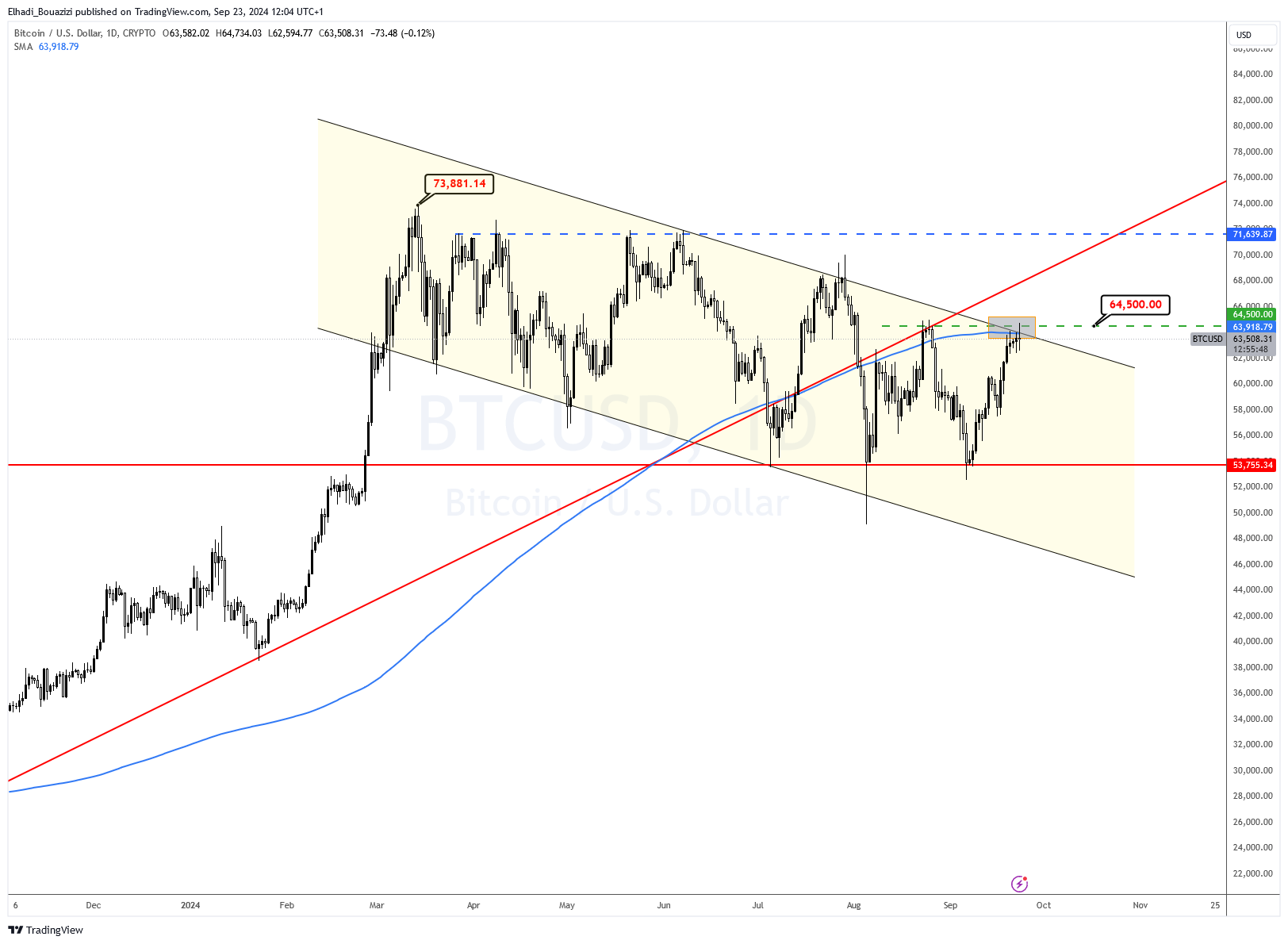 حركة صعود البيتكوين الأخيرة توقفت تحت مستوى المقاومة المحوري و القوي جدا 64,500 دولار، كما هو موضح في الرسم البياني اليومي المرفق.