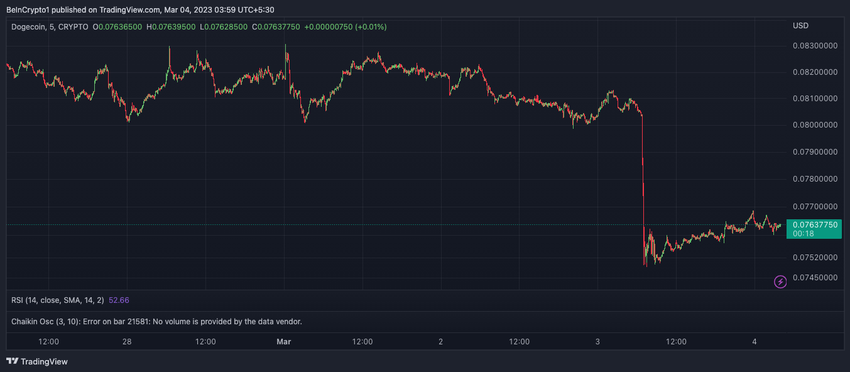 بالنظر إلى الرسم البياني، اخترق سعر دوجكوين DOGE لفترة وجيزة نقطة الدعم السفلى عند 0.0755 دولار. ورافق ذلك انخفاض حاد في مؤشر القوة النسبية لمدة 14 يومًا (RSI) أيضًا إلى ما دون 30٪.