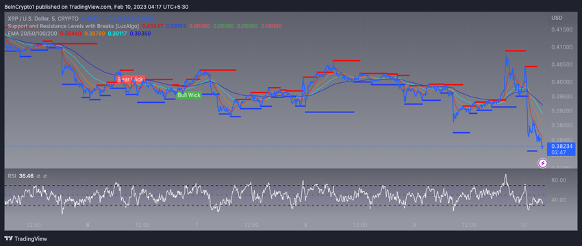 مؤشر القوة النسبية RSI عند 38.14 يشير إلى تواصل انخفاض السعر خلال 10 فبراير. إضافة إلى ذلك يتواجد سعر XRP تحت المتوسط المتحرك الأسي EMA لـ 20 يومًا (عند 0.3916 دولار). ما يؤكد تواصل انخفاض السعر خلال الـ 24 ساعة القادمة.
