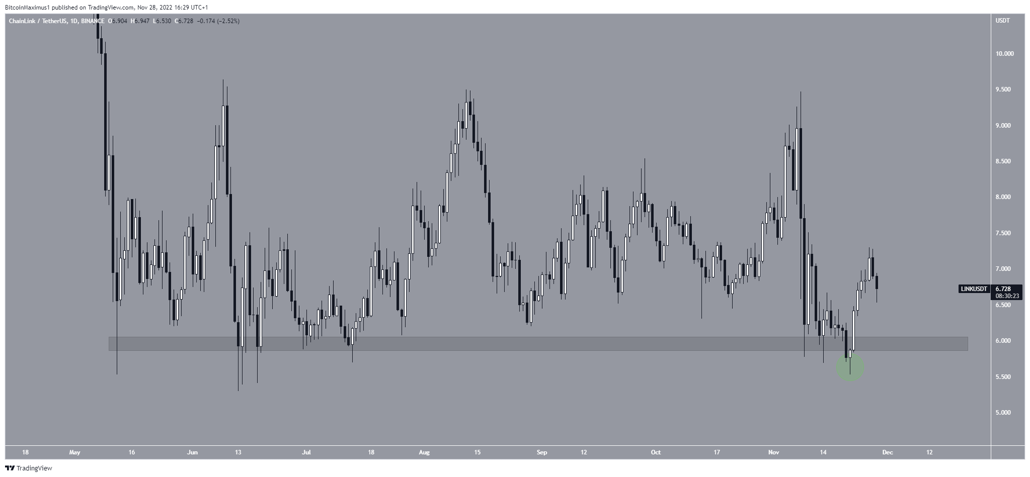 يتداول سعر العملة بالقرب من أدنى مستوياته السنوية، ولكنها ضمن العملات البديلة الأكثر تحفيزاً لدى مجتمع المستثمرين مقارنة بالعملات الأخرى، وفي العشرين من نوفمبر انحرفت العملة إلى ما دون منطقة الدعم الواصلة عند 6 دولار (الدائرة الخضراء) قبل أن تستعيد مكانتها مرة أخرى.