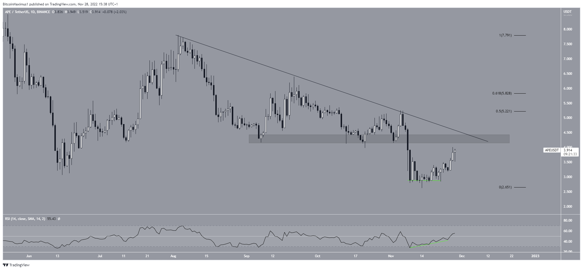 ونتج عن مؤشر القوة النسبية انحراف تصاعدي، سبقه ارتفاع مستمر ومتسارع الوتيرة خلال الأربع وعشرين ساعة الأخيرة، ومن المتوقع أن يواجه السعر مقاومة قوية عند نقطة 4 دولار، يشكلها كل من منطقة المقاومة الأفقية وخط المقاومة التنازلي، لذا، فارتفاع سعر عملة APE في الأيام القادمة سيحدد اتجاهها المستقبلي.