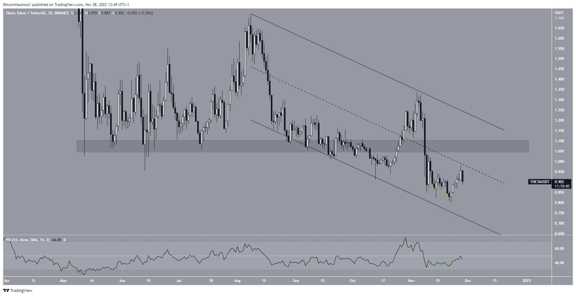 وعلى الرغم من هذا الهبوط في السعر، فقد نتج عن مؤشر القوة النسبية اليومي (RSI) انحرافاً تصاعدياً (متمثلاُ في الضوء الأخضر)، إلا أنه لازال ما دون نقطة 50. ونتيجة لهذا، لازال السعر المتوقع لعملة THETA ومساره غير واضحاً على الإطلاق، فالخروج من منطقة المقاومة عند نقطة 1.05 دولار ومقاومة القناة الهابطة سيؤدي إلى توجهاً صاعداً على المدى الطويل.