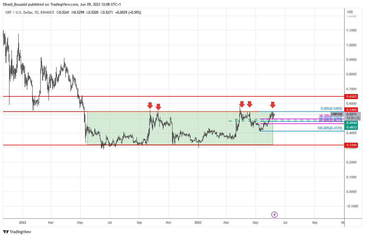 الصورة الكبيرة لحركة سعر عملة ريبل XRP الرسم البياني اليومي يوضح لنا أن السعر منذ مايو من العام الماضي كان يتحرك في مستطيل جانبي محصور بين المستويين 0.3 – 0.55 دولار.