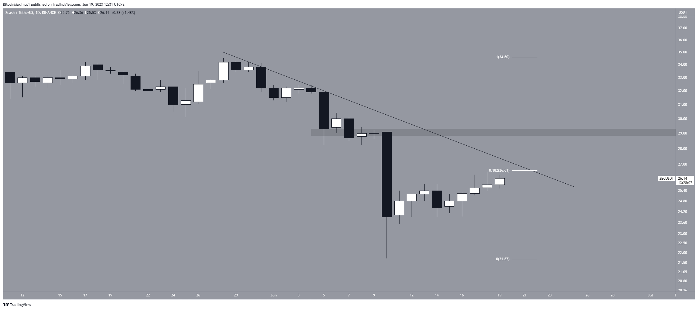 وفي الفترة الحالية، يقترب سعر ZEC من خط المقاومة الهبوطي الساري منذ نهاية مايو. بالإضافة إلى ذلك، يتصادف الخط مع مستوى مقاومة تصحيح فيبوناتشي 0.382 عند 26.60 دولار. لذلك، من المتوقع أن يحدد ذلك الاتجاه المستقبلي سواء كسر السعر أو الانخفاض منه.