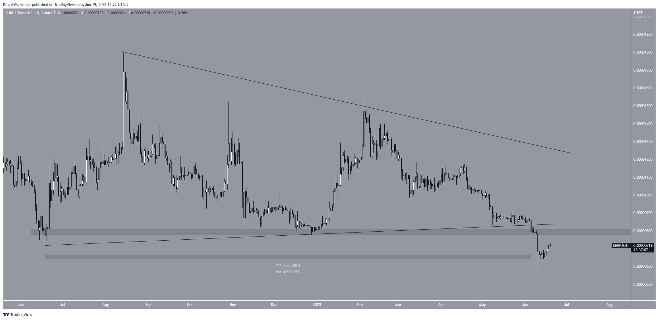 انهار سعر الشيبا من المثلث المتماثل في 5 يونيو. وكان الانهيار حدثًا مهمًا لأن النموذج كان في مكانه لمدة 350 يوم. وعادة ما تؤدي الانهيارات الناتجة عن مثل هذه الهياكل طويلة الأجل إلى حركات هبوطية كبيرة.