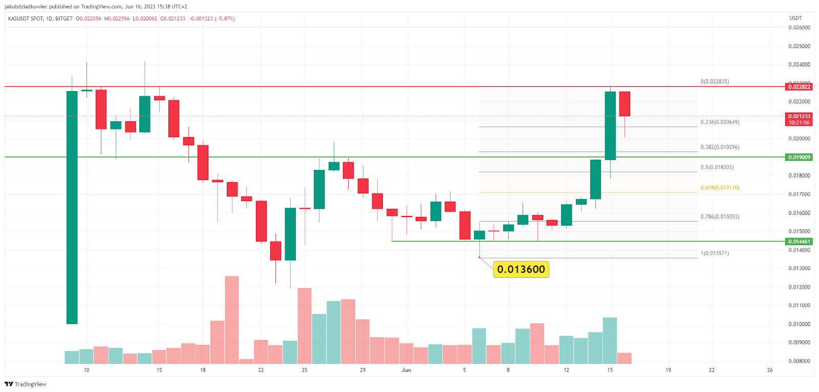 ارتفع سعر عملة KAS منذ وصول القاع عند 0.0136 دولار في السادس من يونيو 2023. ليقدم القاع إشارة تصاعدية لأن إغلاق الشمعة اليومية كان أعلى من شمعة 23 مايو. وهكذا، أسست عملة KAS قاعًا أعلى لتبدأ في اتجاه تصاعدي.