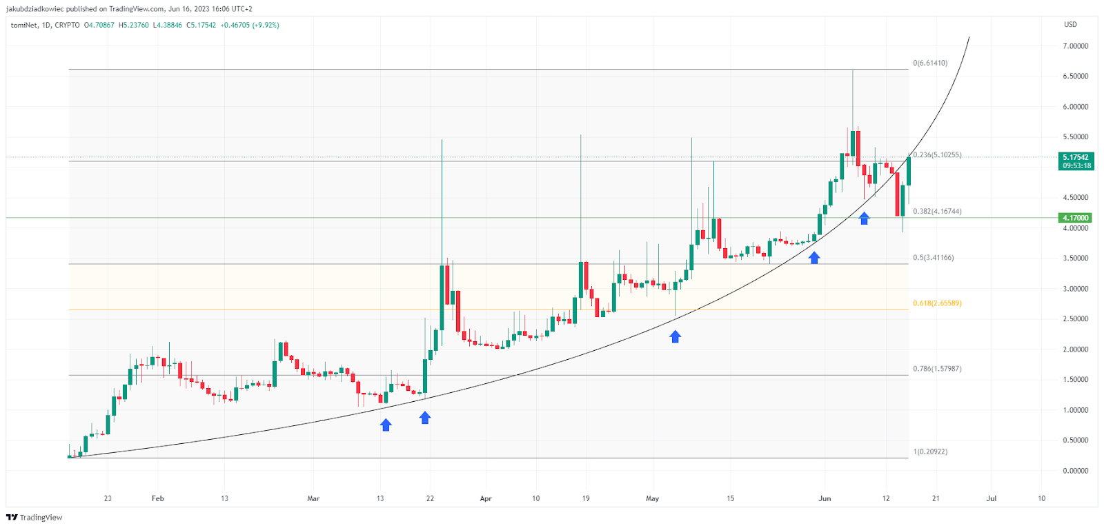 ومع ذلك، لا يمكن الحفاظ على الاتجاه المكافئ الذي وصلت إليه العملة، لينخفض سعر TOMI. ومع ذلك، فإن التصحيح الصغير أدى إلى الموافقة على مستوى تصحيح فيبوناتشي 0.382 عند 4.17 دولار. ثم ارتدت العملة بقوة. وتقوم العملة المشفرة حاليًا بإعادة اختبار هبوطي لخط الدعم المكافئ، والذي كان قائمًا منذ يناير 2023.