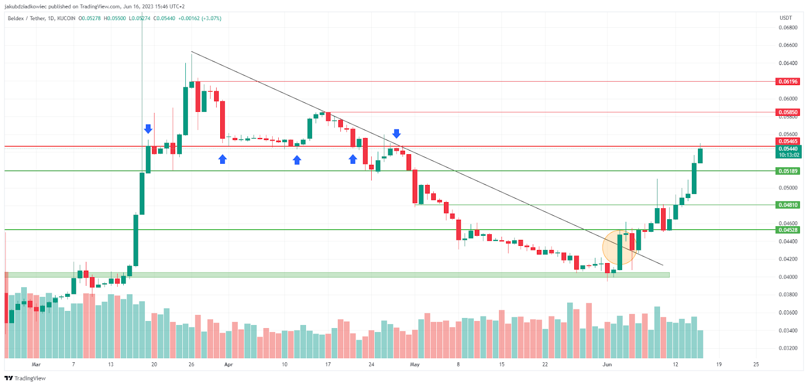 وأدت الحركة التصاعدية إلى المقاومة الأولى عند 0.052 دولار، والتي تم اختراقها هذا الأسبوع. وحاليًا، يواجه سعر BDX منطقة مهمة أخرى عند 0.055 دولار، والتي تم التحقق من صحتها كمقاومة ودعم (الأسهم الزرقاء).