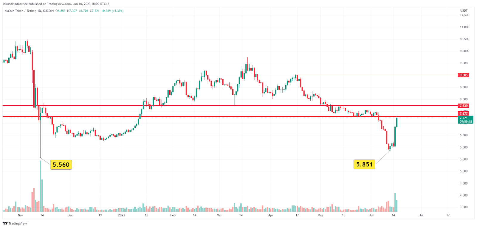 تمثل عملة KCS العملة الأصلية لبورصة KuCoin وهي في اتجاه هبوطي طويل الأجل منذ الوصول لأعلى المستويات عند 28.83 دولار في 1 ديسمبر 2021. ووصل قاع السوق الهابطة حتى الآن إلى 5.56 دولار في 13 نوفمبر 2022.