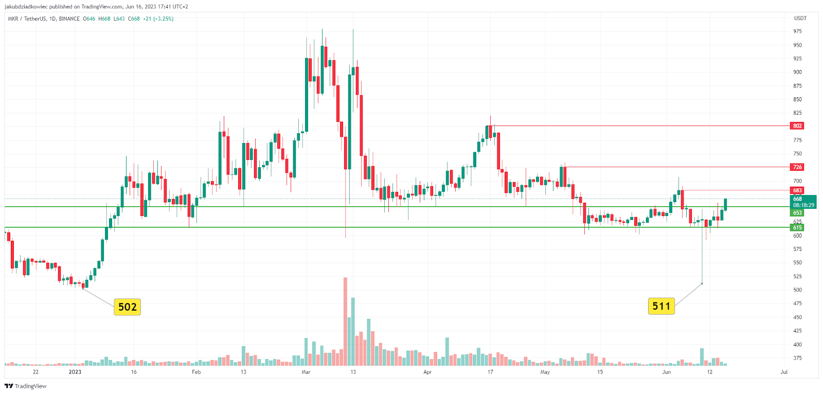 ومع ذلك، أدت التطورات الأخيرة في سوق العملات المشفرة إلى انخفاض سعر عملة MKR إلى أدنى مستوى أعلى قليلاً عند 511 دولار في 10 يونيو. وقد زاد الفتيل السفلي الطويل في ذلك اليوم من ضغط الشراء، لتبدأ العملة البديلة في الارتداد.