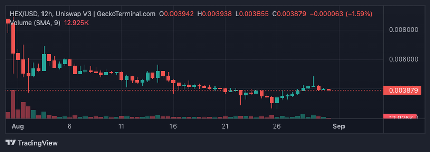 وفقًا للبيانات على السلسة، انخفض مؤشر HEX بنسبة 7.63% خلال الـ 24 ساعة الماضية. لكنه شهد انخفاضًا أعمق بنسبة 41.1 % خلال الثلاثين يومًا الماضية. حيث يتم تداول الأصل عند 0.00387888 دولارًا صباح 31 أغسطس.
