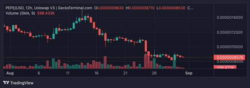 Sponsoredمن منتصف يوليو، عرف سعر PEPE انحدارًا مستمرًا. وخلال شهر أغسطس، تم تداول ثالث أكبر عملة ميم بين نطاقي 0.00000141 دولار و 0.000000825 دولار. مما يشير للتقلب الكبير في سعرها.