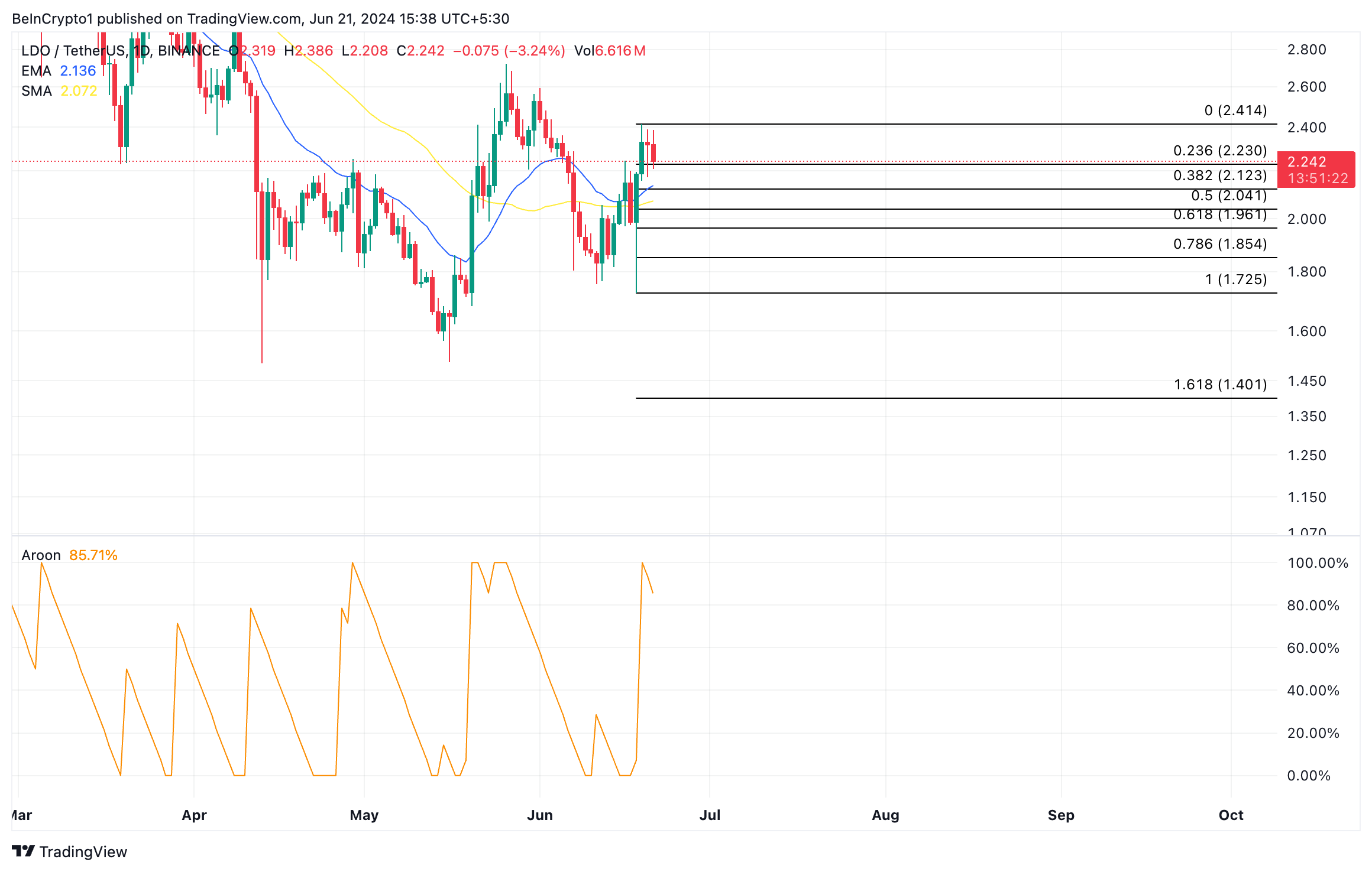 أدى الارتفاع في نشاط تداول LDO في الأيام القليلة الماضية إلى تداوله بشكل كبير فوق المتوسط المتحرك الأسي لـ 20 يومًا (EMA) (الأزرق) والمتوسط المتحرك البسيط لـ 50 يومًا (SMA) (الأصفر).