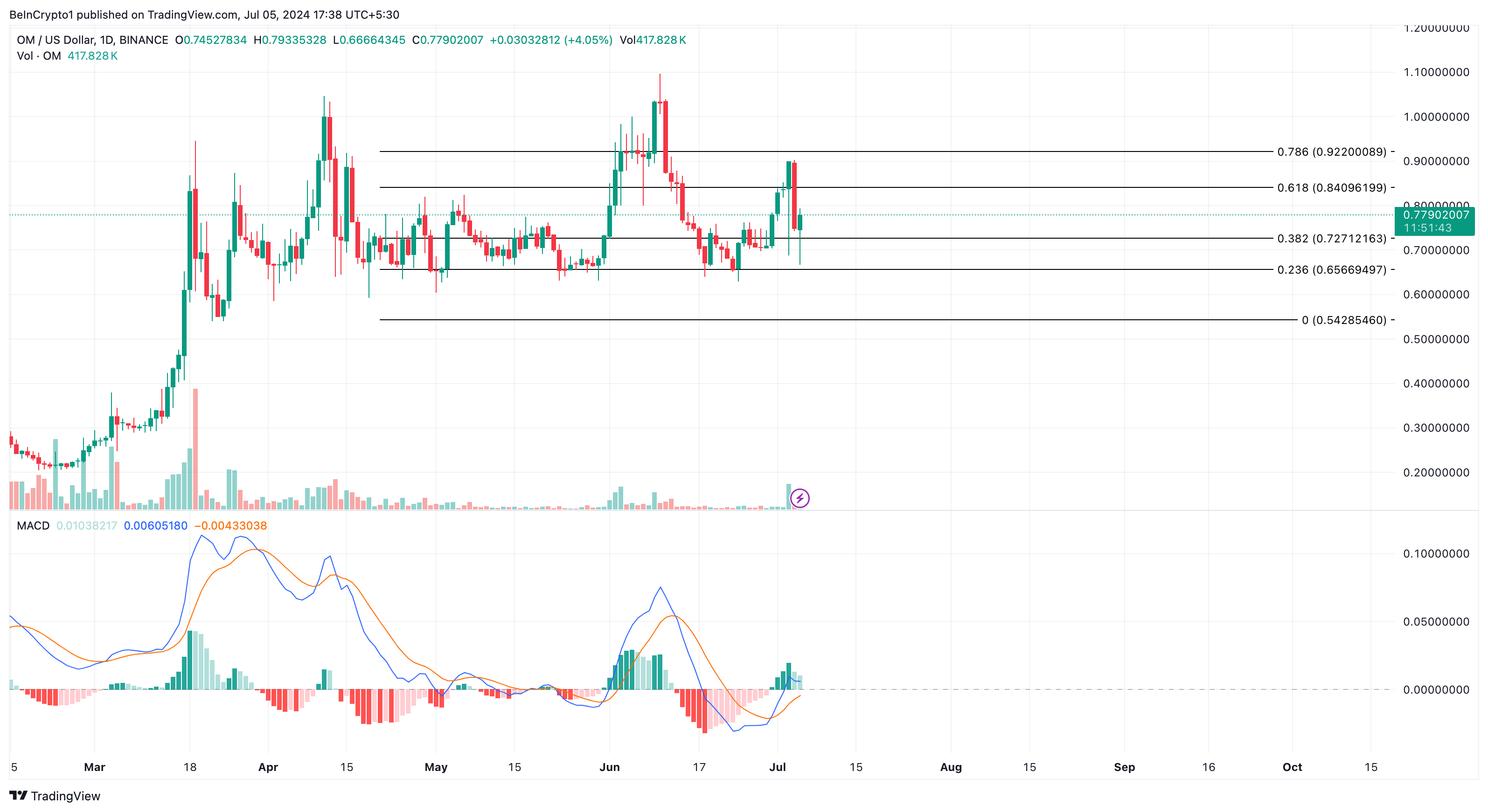 بعد ذلك، انخفض القيمة إلى 0,74 دولار قبل الانتعاش الأخير. وفقًا للرسم البياني اليومي OM/USD، فإن مؤشر التقارب والتباعد للمتوسطات المتحركة (MACD) إيجابي.