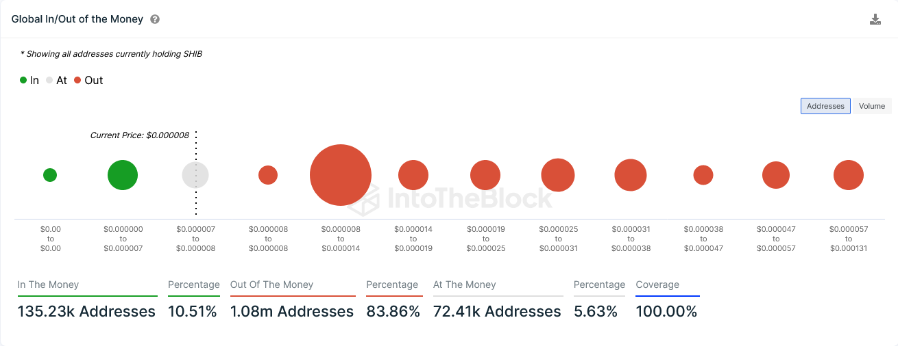 فحسب أرقام من منصة بيانات سلاسل الكتل IntoTheBlock. فإن 11% فقط من حاملي عملة شيبااينو SHIB رابحون. و 7% هم في وضع التعادل، بينما 82% يعانون من خسائر غير محققة.