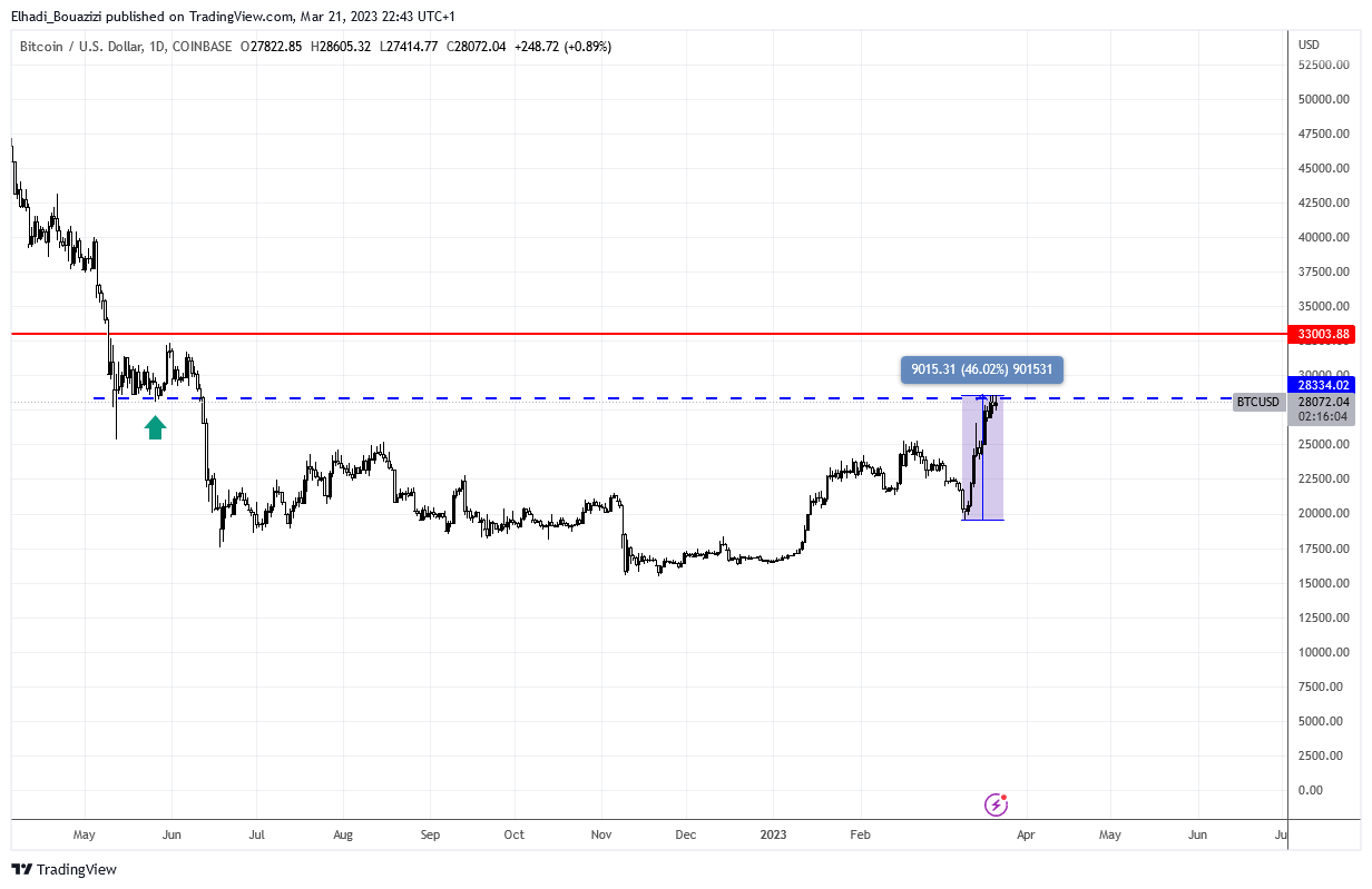 فبعد انهيار بنك سيليكون فالي SBV وبنك سيجنتشر Signature. إضافة إلى بيع العملاق المصرفي السويسري كريدي سويس إلى منافسه يو بي إس UBS يوم الأحد. وصل سعر أول وأكبر عملة رقمية مشفرة في العالم إلى أعلى مستوى لها منذ يونيو من العام الماضي.