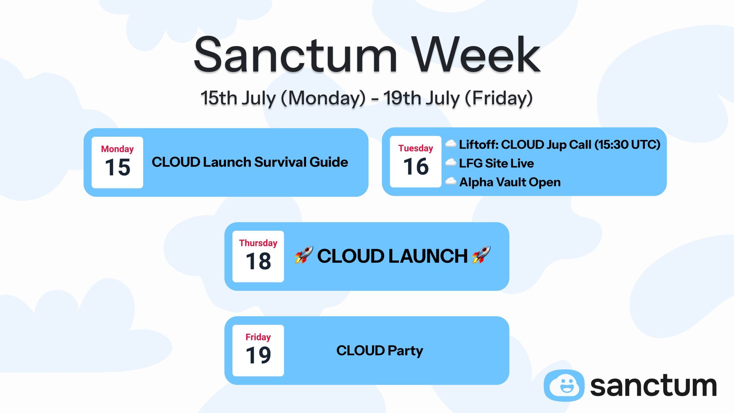 في 10 يوليو ، أعلنت Sanctum ، وهي منصة تخزين سائلة مقرها Solana ، عن خطتها لإطلاق رمزها الأصلي CLOUD على منصة إطلاق Jupiter للتبادل اللامركزي (DEX) في 18 يوليو. في 16 يوليو الساعة 15:30 بالتوقيت العالمي المنسق ، سيوفر إصدار خاص من Planetary Call ، يسمى "Liftoff" مع كوكب المشتري ، معلومات إضافية حول الإطلاق. بعد ذلك ، في 19 يوليو ، ستستضيف Sanctum حفلة CLOUD.