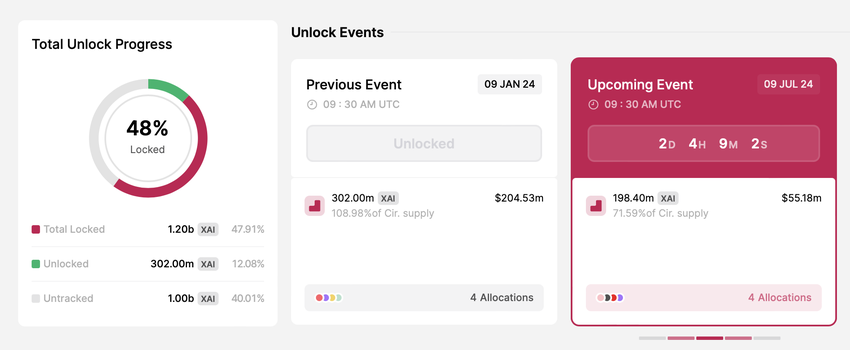 زاي، حل الطبقة الثالثة (L3) المصمم لألعاب AAA، سيطلق ما يقرب من 200 مليون رمز XAI في 9 يوليو. الكمية، التي تقدر بحوالي 55,18 مليون دولار، تمثل 71,59% من إجمالي العرض المتداول. لذلك، أثار هذا الإطلاق نقاشات بين مجتمع العملات المشفرة حول تأثيره المحتمل على سعر XAI.