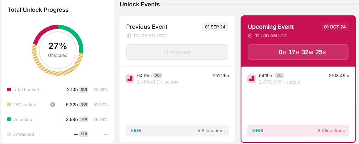 أحد الأحداث البارزة هذا الأسبوع هو إطلاق 100 وحدة من رموز SUI . ستطلق SUI 64,19 مليون رمز للمساهمين المبكرين والمستثمرين، بالإضافة إلى خزانتها. يمثل هذا المبلغ 2,4% من إجمالي العرض المتداول.