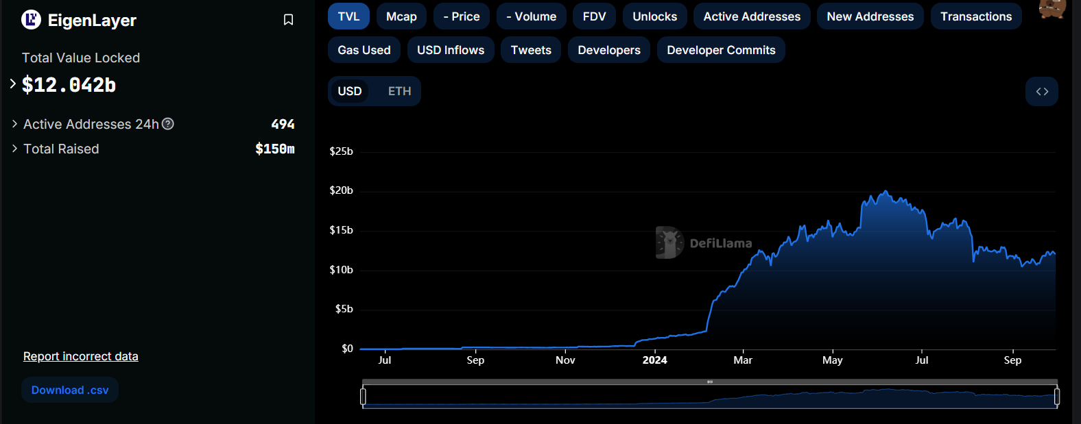 هذه لحظة حاسمة لبروتوكول EigenLayer. فحسب بيانات منصة DefiLlama، تمتلك EigenLayer أكثر من 12 مليار دولار في القيمة الإجمالية المقفلة (TVL) وقت كتابة هذا التقرير، مما يجعلها ثاني أكبر منصة DeFi من حيث القيمة المقفلة.