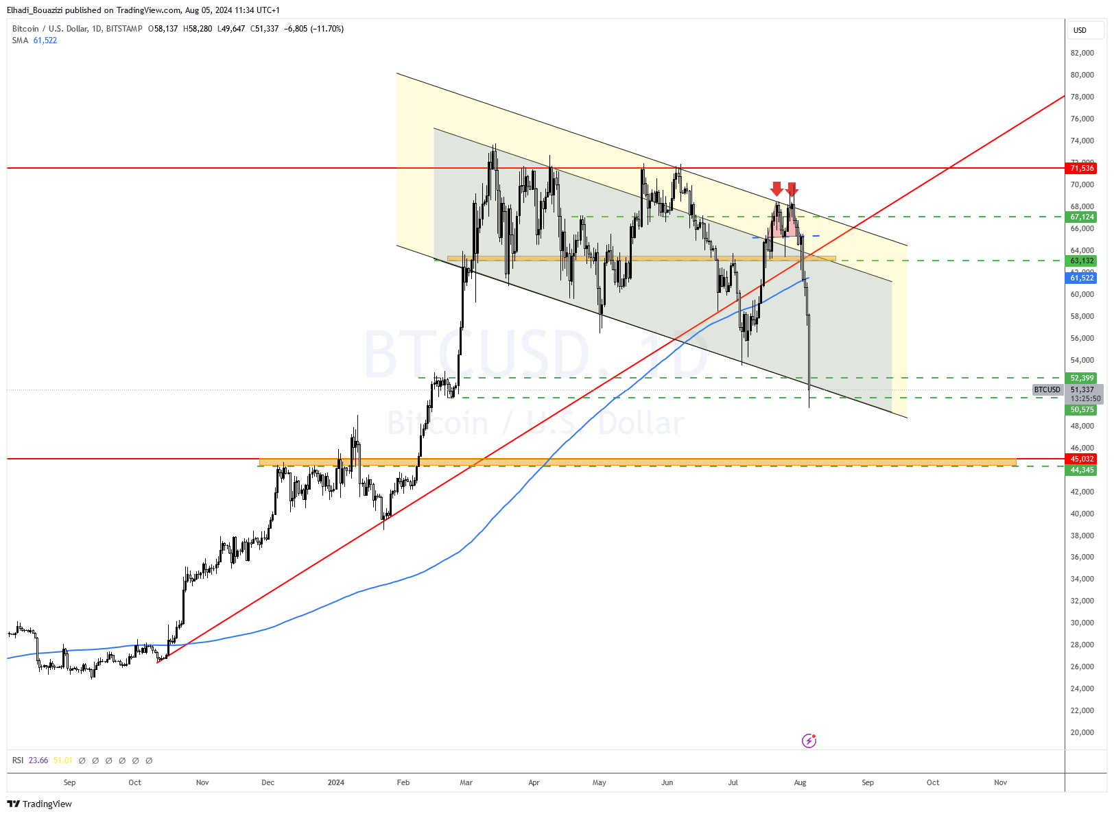 في هذا الانهيار، كسر السعر كل مستويات الدعم السابقة ليصل إلى أدنى مستوى منذ منصف فبراير الماضي، من بينها القاع السابق عند مستوى 55,700 دولار .