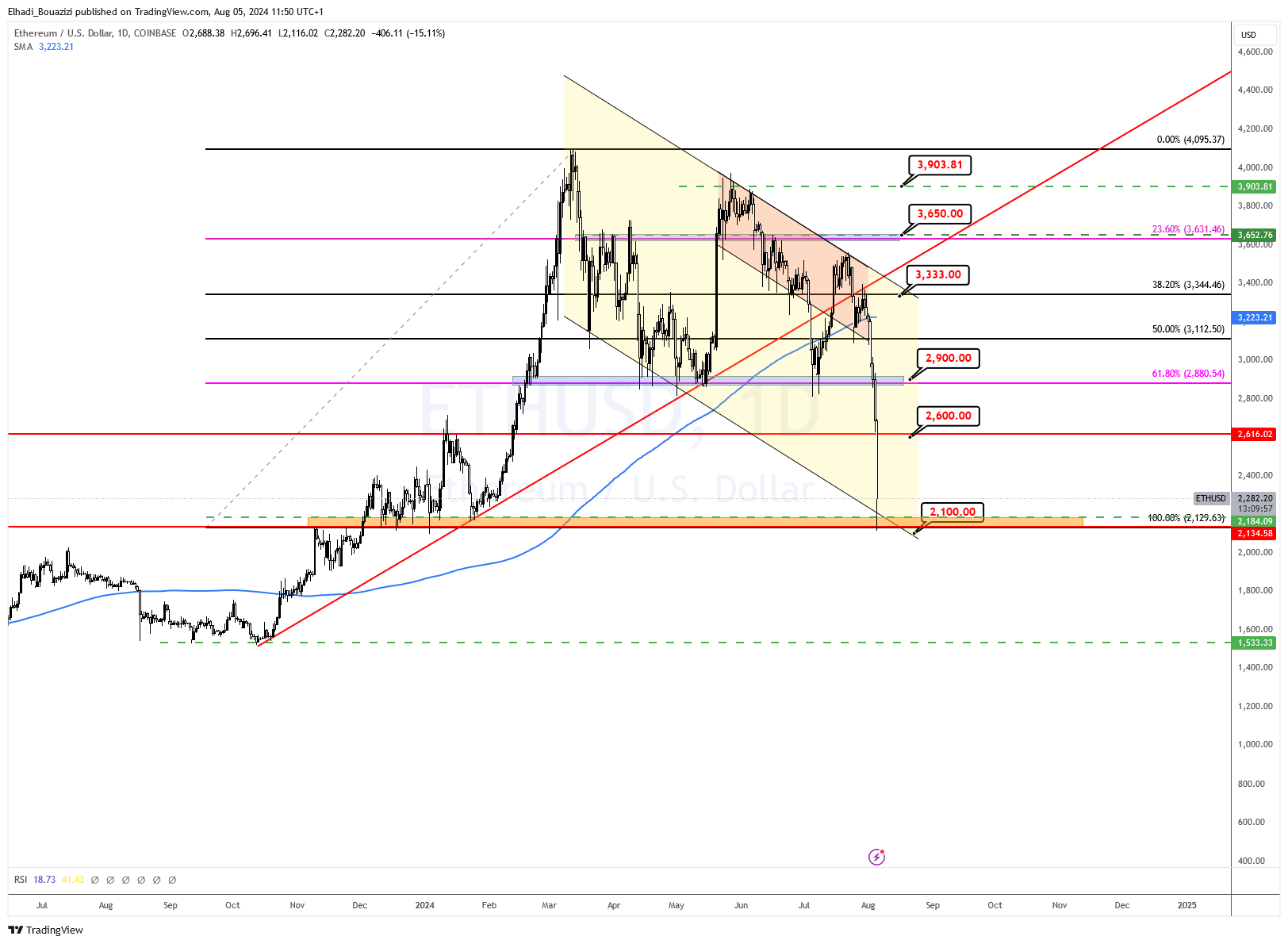 و حاليا في وقت الكتابة، يتداول عند 2230 دولار بعد أن اختبر الحد السفلي و أيضا مستوى الدعم المحوري 2100 دولار. كسر هذا الدعم القوي سوف يفتح الباب أمام المزيد من الهبوط و نحو مستوى 1500 دولار.