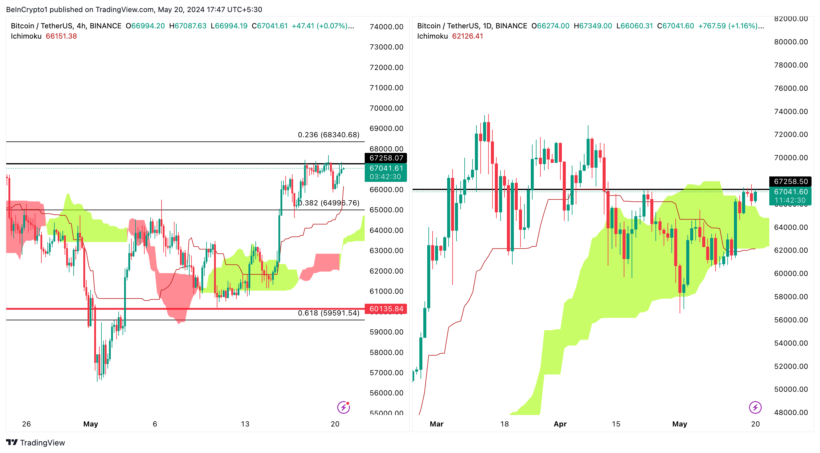 لقد أثبتت حركة سعر البيتكوين الأخيرة صحة رؤى الأسبوع الماضي. اخترق السعر فوق غيمة Ichimoku ليوم واحد، ليصل إلى 67500 دولار. في الوقت الحالي، واجه مقاومة قصيرة المدى عند 67300 دولار.