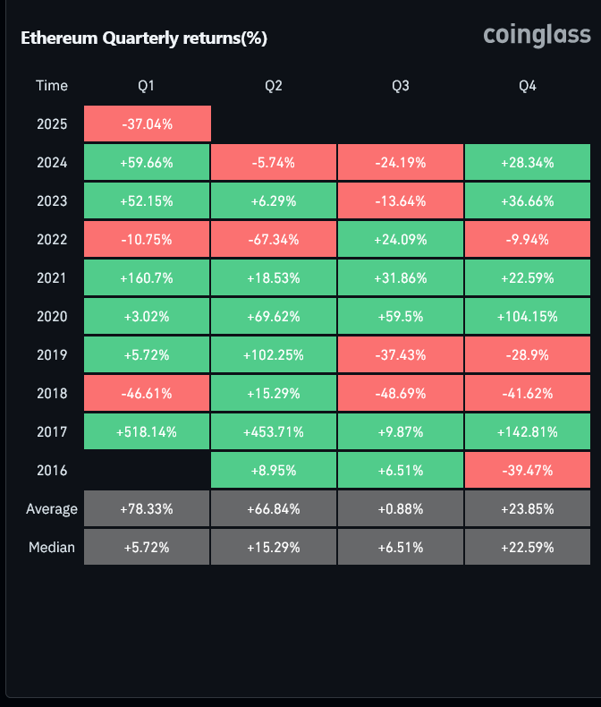 حاليا، سعر إثيريوم منخفض بنسبة 37% على أساس فصلي ويشير المحللون إلى أن استمرار هذا الاتجاه الهابط قد يدفع إيثريوم نحو مستوى 1600 دولار، ما سيجعل الربع الأول من 2025 الأسوأ على الإطلاق.
