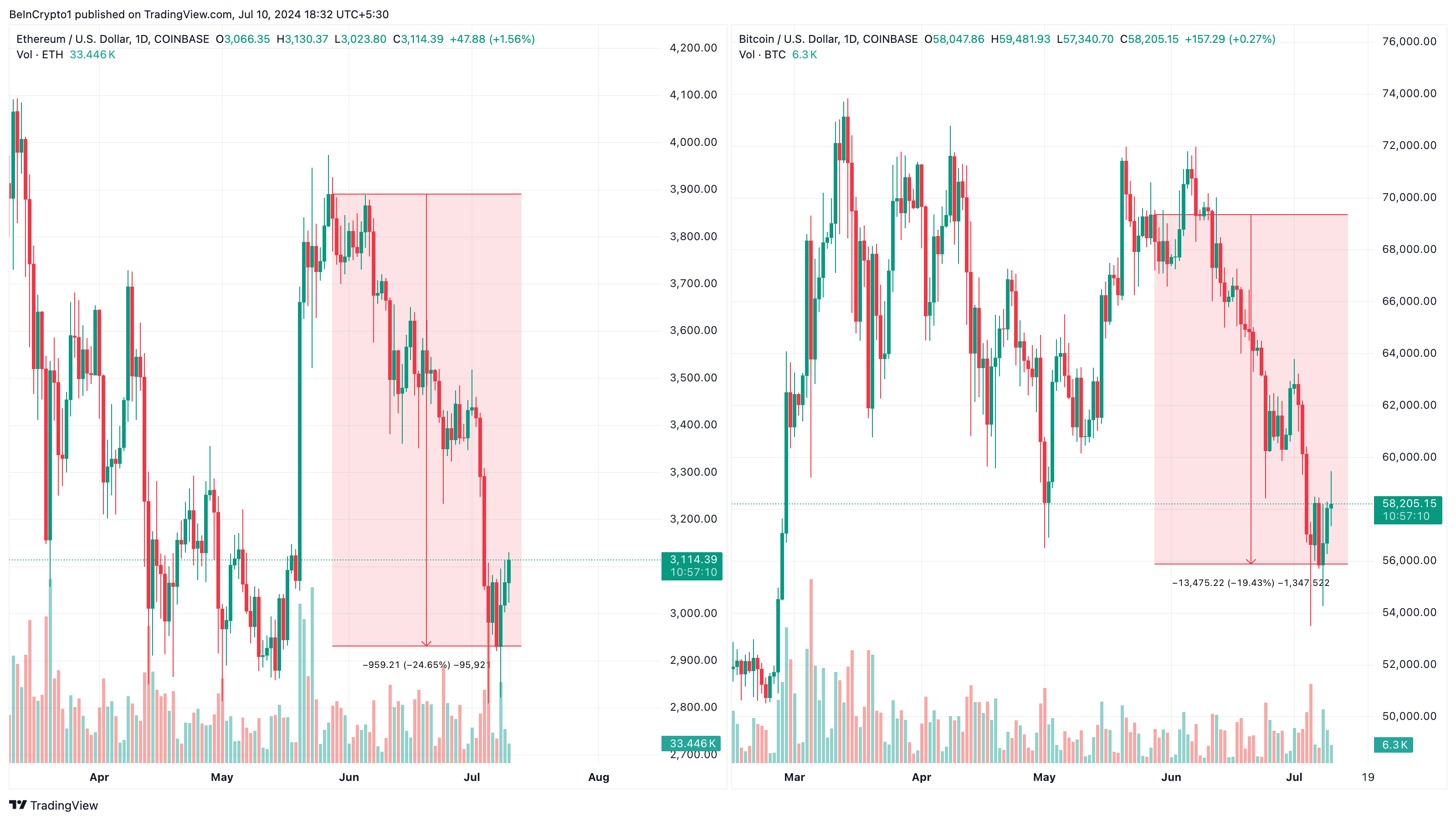مقارنة بالبيتكوين، شهد سعر الإيثيريوم تصحيحًا أكبر. من 28 مايو إلى 9 يوليو، انخفض سعر الإيثيريوم بنسبة 24,65%.