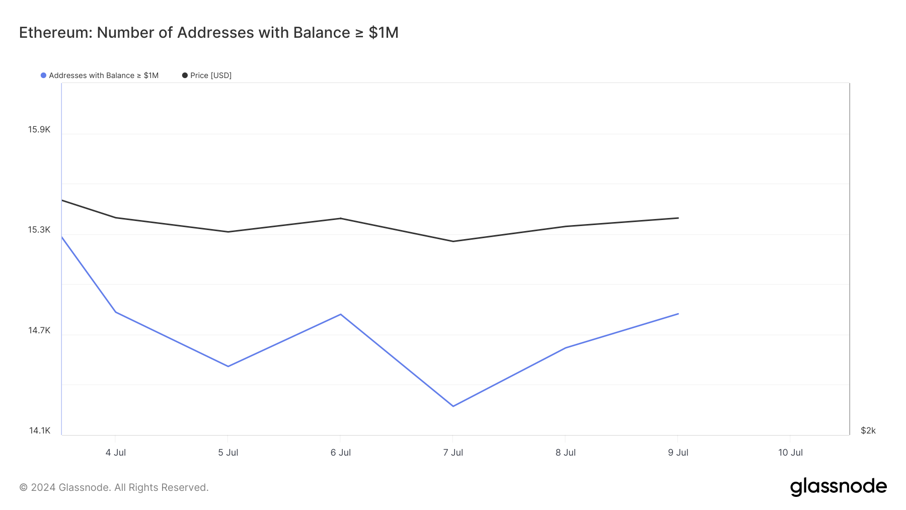 عدد العناوين التي تحتفظ بقيمة إيثيريوم تساوي مليون دولار أو أكثر يظهر دليلاً على هذا النشاط. في 7 يوليو، كان هذا المقياس 14,217. ومع ذلك، اعتبارًا من هذه الكتابة، ارتفع الرقم إلى 14,823، مما يعكس زيادة في الطلب على العملة الرقمية والتفاؤل حول موافقة صندوق الاستثمار المتداول للإيثيريوم الفوري.