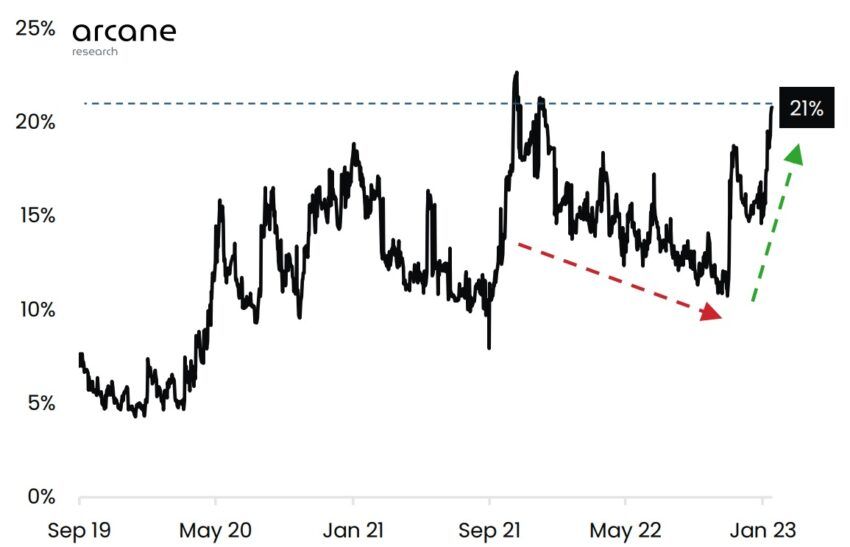 وبحسب بيانات منصة Arcane Research، ثمة زيادة في التدفق المؤسسي، حيث الاهتمام بالعقود الآجلة لعملة البتكوين بنسبة 21% في بورصة شيكاغو التجارية، وتقترب هذه القيمة من أعلى المستويات، بعد أن كانت المدد الزمنية الأعلى في شهر أكتوبر 2021 وأواخر ديسمبر 2021، حينما تم الإصدار لصناديق الاستثمار المتداولة المستندة إلى العقود الآجلة.