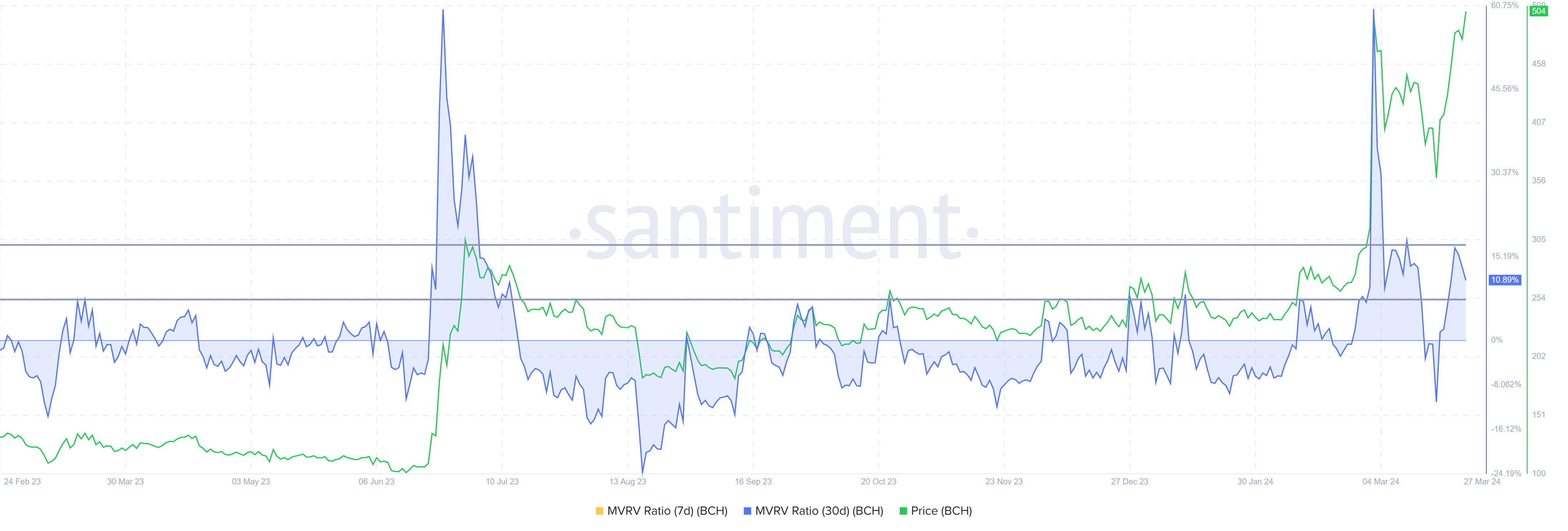 وتشير نسبة MVRV للقيمة السوقية للبيتكوين كاش (MVRV) لمدة 30 يومًا عند 10% إلى الربح، مما قد يدفع إلى البيع. من الناحية التاريخية، حدثت تصحيحات البيتكوين كاش عندما يكون المؤشر بين 7%-17% MVRV، والتي تُسمى منطقة الخطر.