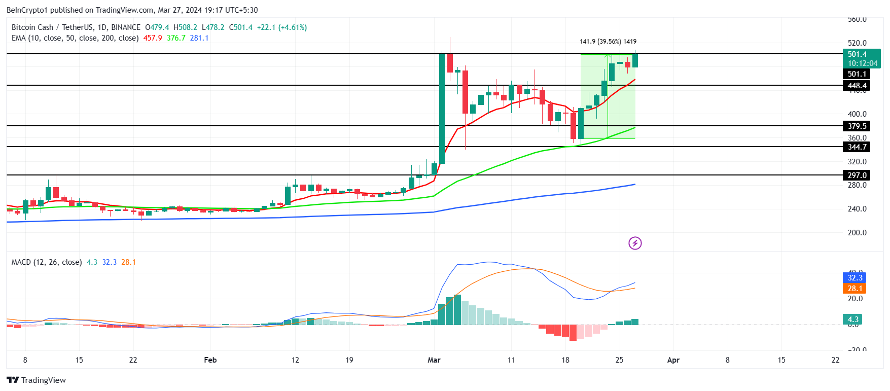 ومع ذلك، يمكن للعملة البديلة أن تبطل الأطروحة الهبوطية إذا نجح اختراق واختبار 501 دولار كدعم. عندها ستكون BCH مفتوحة للارتفاع نحو 520 دولارًا.