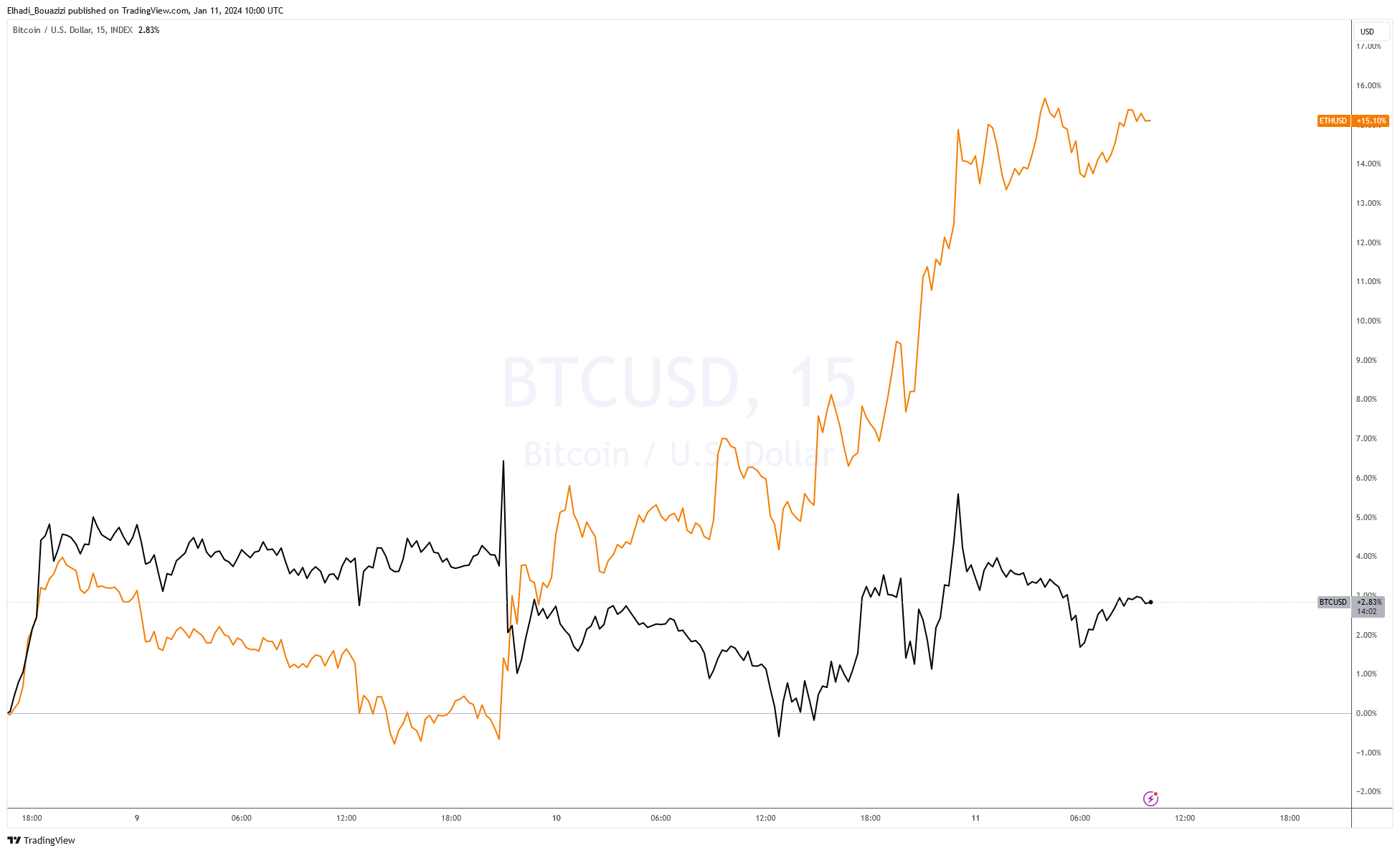 في حين أن عملة إيثريوم كانت أكبر الفائزين حيث سجّلت ارتفاع بأكثر من 12% في تداولات يوم أمس. لأن الكثير من المتابعين، يتوقعون أن تكون صناديق ETF إيثريوم ETH هي التالية في قائمة منتجات المؤسسات المالية.