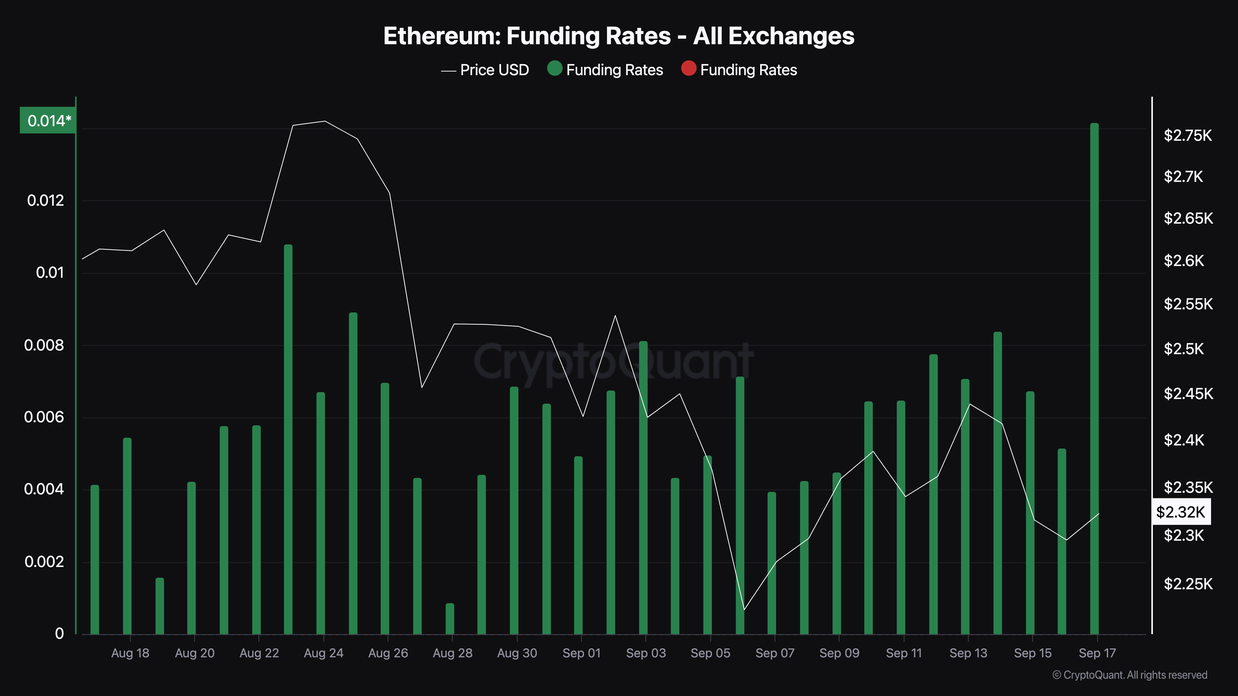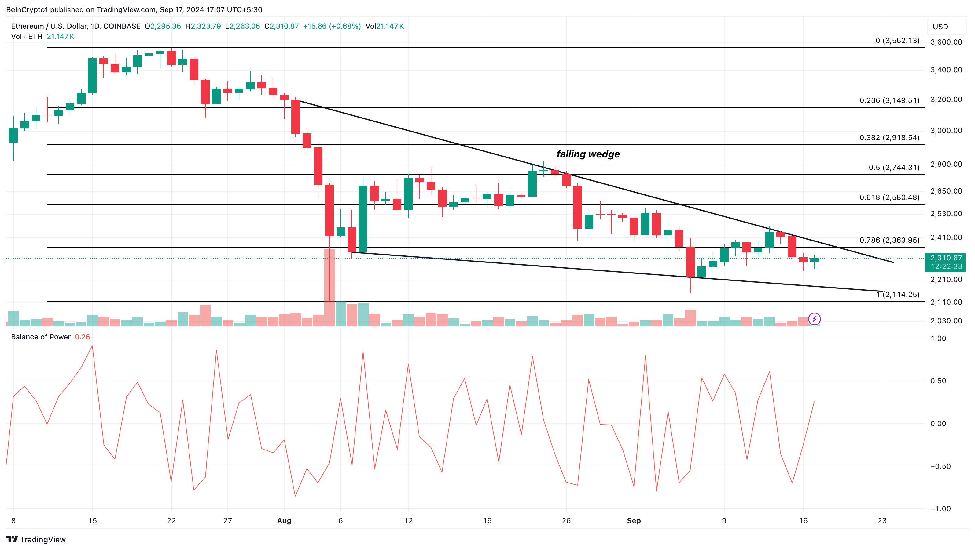 يقف سعر إيثريوم حاليًا حول 2 310 دولارًا. في 13 سبتمبر، حاولت العملة المشفرة تجاوز 2 441 دولارًا لكنها واجهت رفضًا. ومع ذلك، تشكل نمط الوتد الهابط على الرسم البياني اليومي، مما يشير إلى احتمال حدوث اختراق.
