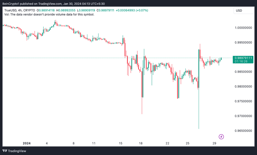 نقطة مقلقة أخرى وفقًا للعديد من المحللين. إذ يبدو أن عملة ترو (True) المستقرة (TUSD) أكثر تقلبًا من المعتاد وهناك خطر فك الارتباط يلوح في الأفق. في الواقع، يواجه العملة المستقرة صعوبة في الحفاظ على ارتباطها بالدولار الأمريكي (USD).