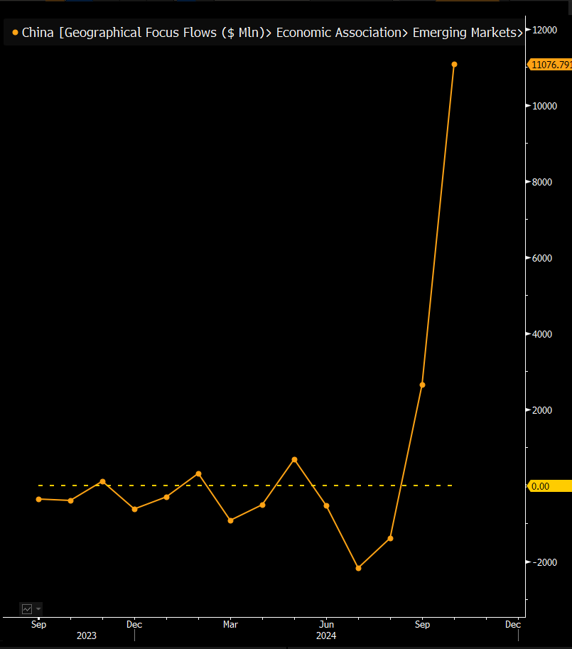 "عام الثور: إجمالي التدفقات الداخلة لصناديق الاستثمار الصينية في أكتوبر حتى الآن 11 مليار دولار. يا له من رسم بياني. ستفعل مشتريات الأصول البالغة 90 مليار دولار من قبل الحكومة ذلك..." قال بالتشوناس في منشور يوم الاثنين.