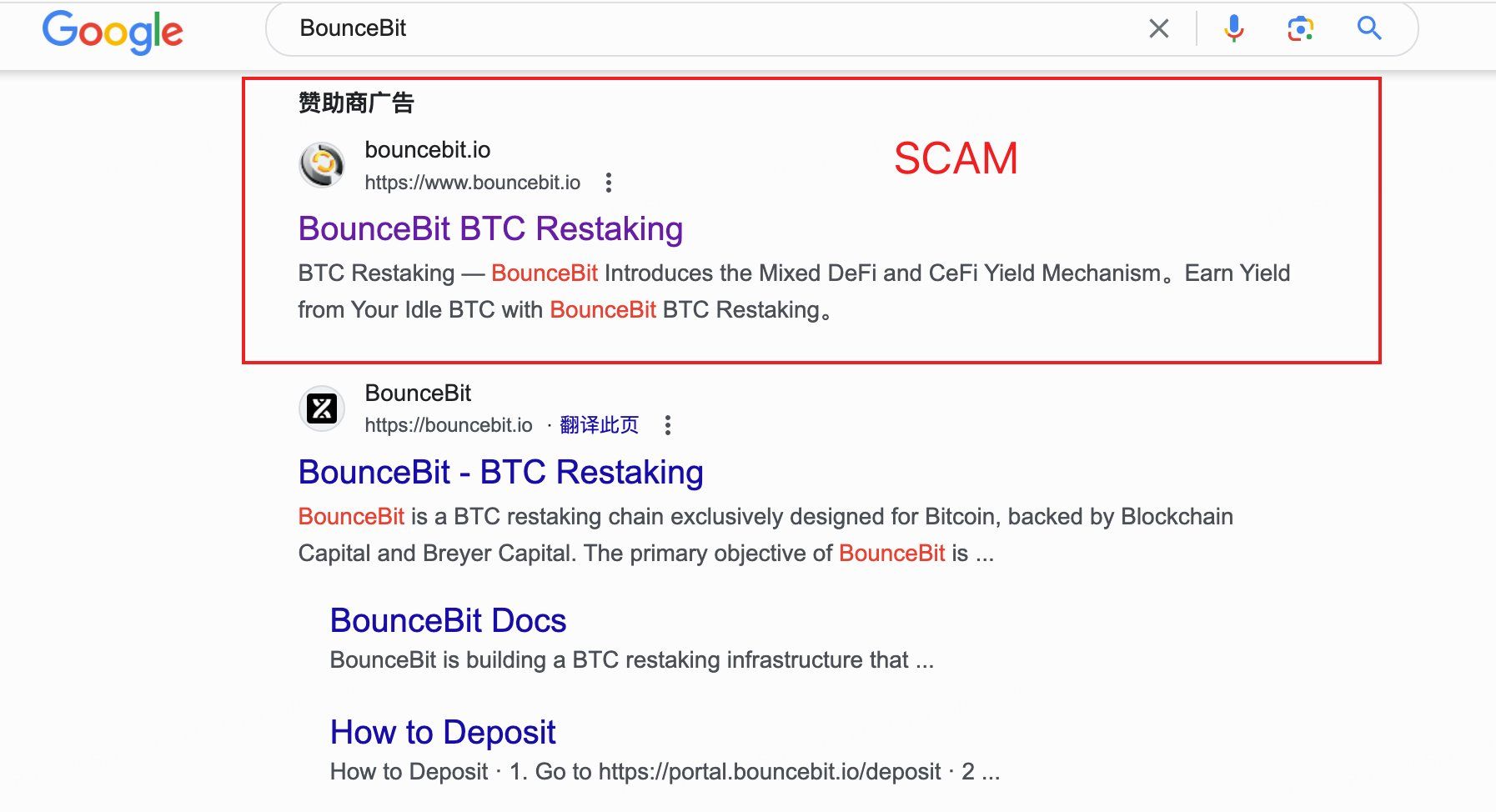 ومع ذلك، فقد خفف تنبيه الأمن السيبراني من الإثارة. أشار رئيس قسم المعلومات والأمن في SlowMist، المعروف باسم 23pds ، إلى خطر كبير. أول نتيجة بحث على Google لـ "BounceBit" هي موقع تصيد يسمى bouncbit.io، مما يشكل تهديدات لسلامة المستخدمين.